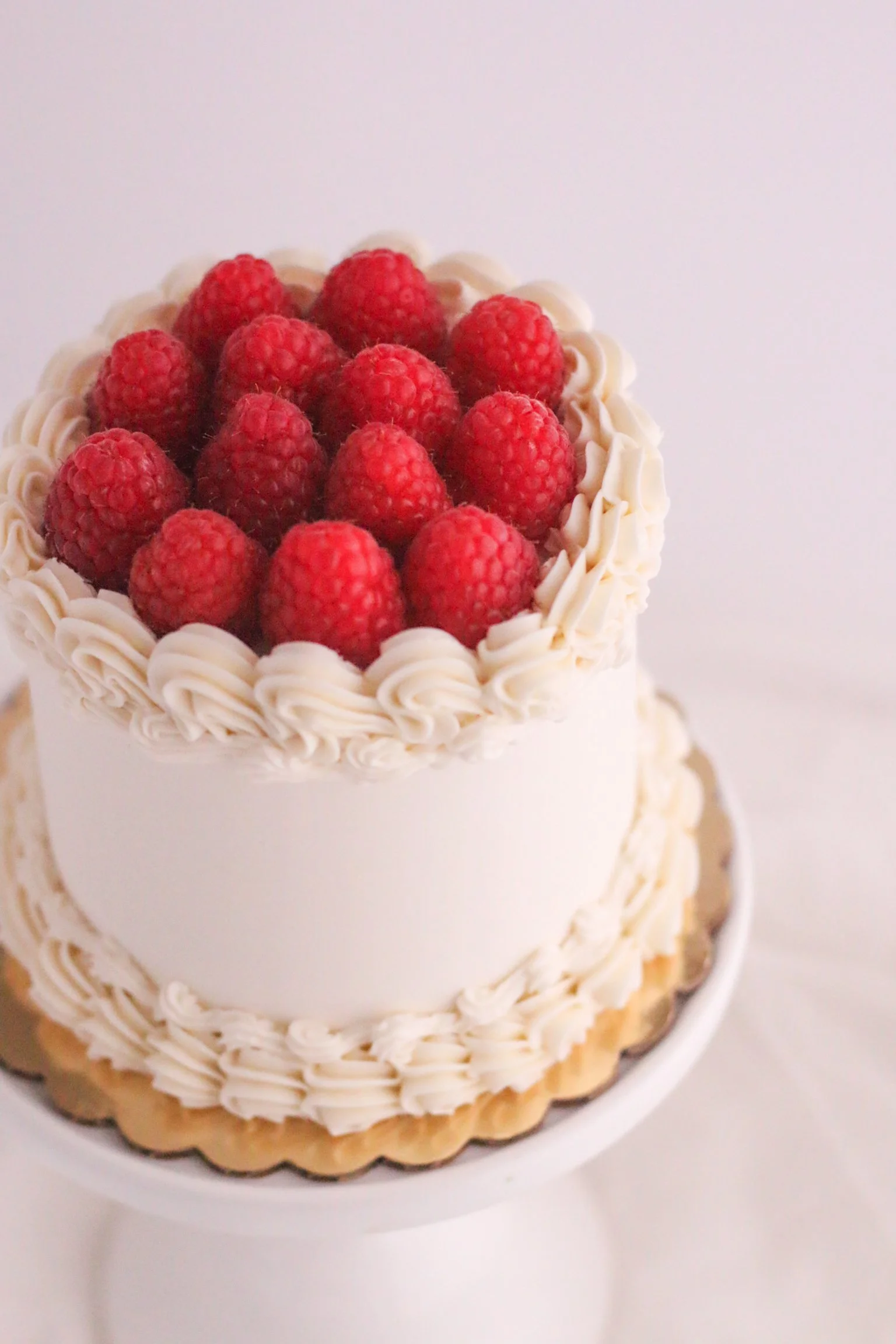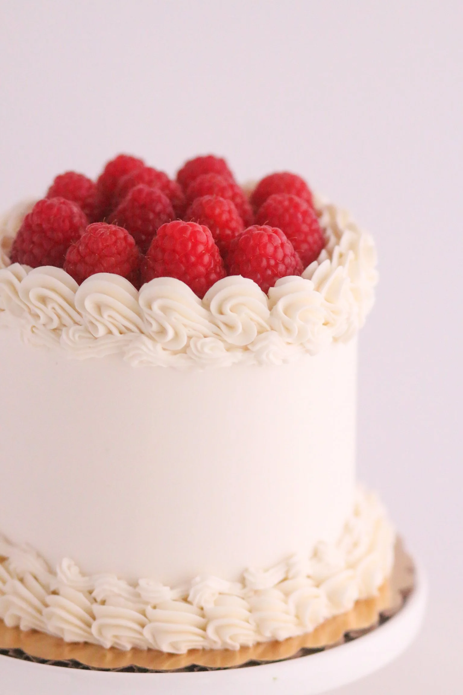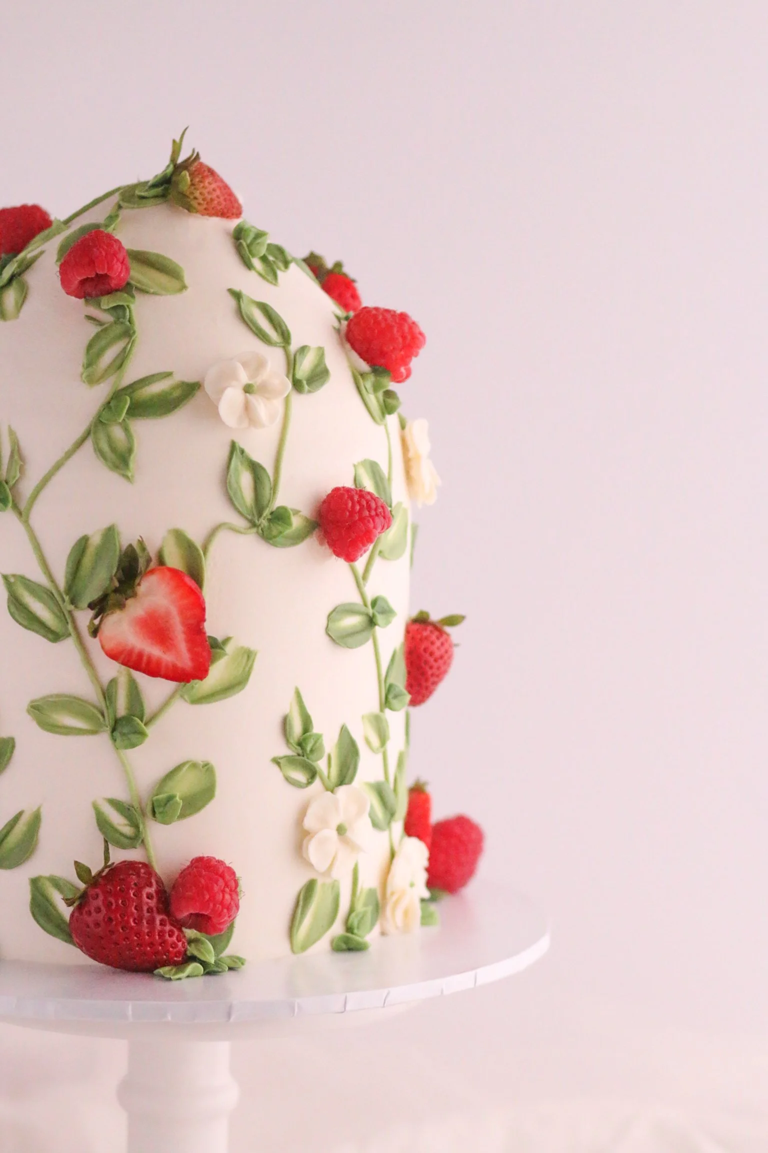 /A set of four fruit mini cakes: blueberry, cherry, lemon, and tomato; decorated with vintage buttercream piping for an Italian-themed birthday. Custom celebration cakes by Rose Vanilla in Fairfax, VA.