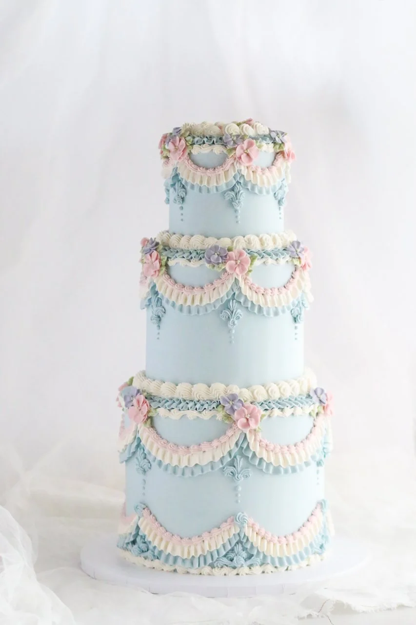 Every tiered cake is a masterpiece of buttercream mastery, adorned with an abundance of delicate and lifelike floral designs. Each petal is skillfully piped and assembled precisely, resulting in a breathtaking floral display cascading down the tiers.